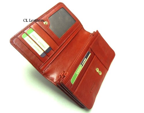 These Large Red Very High Quality Tough Durable Leather Flap Over Purses Have Three Full Size Note Sections That Separates Two Zip Top Closure Coin Pockets. The Under Side of the Flap has a Display window,Three Card slots and Two Note Sections the Front has Another Two Card Slots and all is Secured With Double Press Stud Tab Closure. Dimensions. Height = 10cm. Length = 18cm. Width = 4cm. An ideal quality gift idea.(Now with Free UK Delivery)